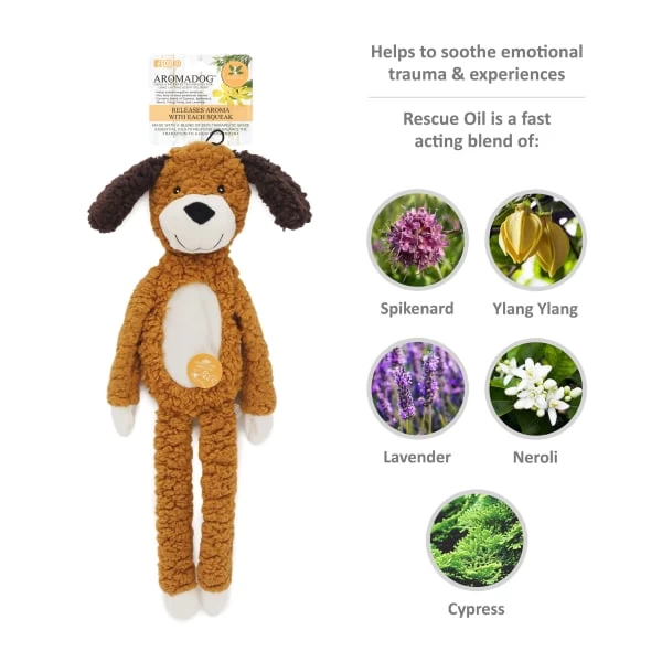 Aromadog™ rescue toys can help soothe emotional trauma and experiences. Made with lavender blend of 100% therapeutic grade essential oils to help calm your dog. Releases aroma with each play and squeak. Aromadog™ rescue flattie dog toy with lavendar essential oils.