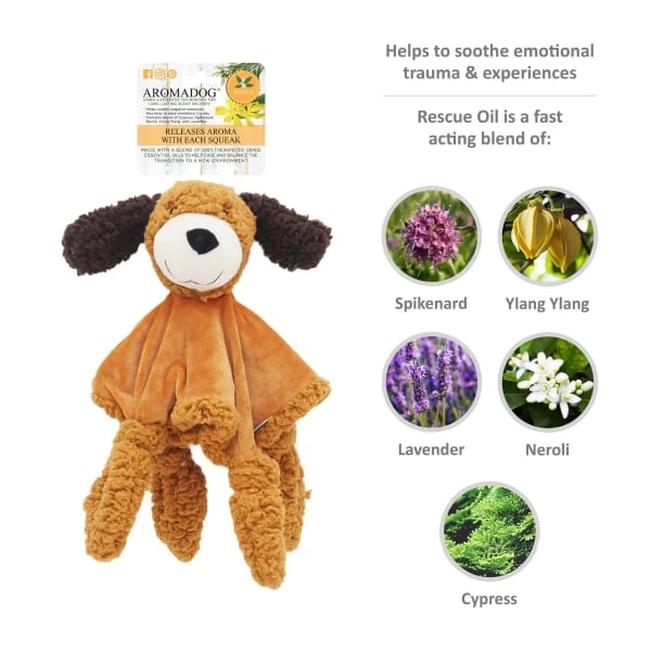 Aromadog™ rescue toys can help soothe emotional trauma and experiences. Made with lavender blend of 100% therapeutic grade essential oils to help calm your dog. Releases aroma with each play and squeak. Aromadog™ rescue stuffingless security blanket with lavendar essential oils.