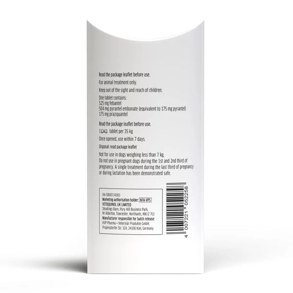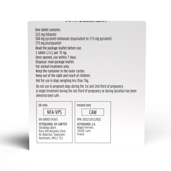 Each tablet contains 525mg febantel, 175mg pyrantel (equivalent to 504mg pyrantel embonate) and 175mg praziquantel.
