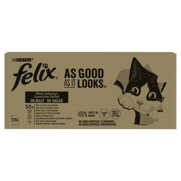 Felix As Good As It Looks is a range of irresistible meals that look, smell and taste so delicious they’re just like food you might have cooked yourself. Each recipe has tender pieces in succulent jelly for a tasty meal your cat can really get his teeth into! Felix® As Good As It Looks® is available in a wide range of delicious recipes in savoury jelly to satisfy your cat’s love of variety every day. They really do taste as good as they look!