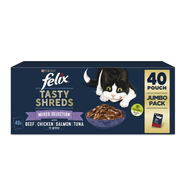 Felix Tasty Shreds are a new taste sensation your cat won’t be able to resist. This selection pack contains four delicious flavours of bite size shredded pieces in a mouth watering gravy. With vitamins and no added preservatives, colours or flavours, just a great tasting and well balanced complete cat food.