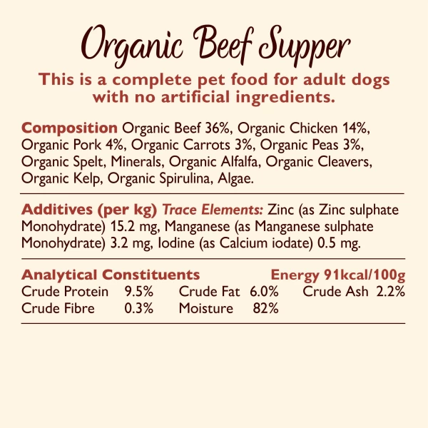 Beef (36%), Chicken (14%), Pork (4%),Organic Vegetables 5% (Organic Carrots and Organic Peas), Organic Spelt, Vitamins and Chelated Minerals, Organic Alfalfa, Organic Cleavers, Organic Kelp, Organic Spirulina.