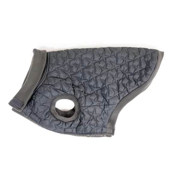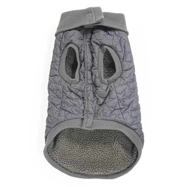 Reversible star quilted gilet with sherpa reverse. The perfect way to keep our pooches warm and cosy this festive season and beyond. Easy pull on-off style with leash hole and ribbed collar for extra warmth. Machine washable.