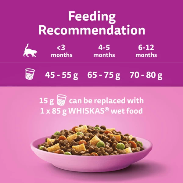 24h Daily Feeding Recommendation ≤ 3 Months: 45 – 55 g, 4 – 5 Months: 65 – 75 g, 6 -12 Months: 70 – 80 g 15 g dry food can be replaced with 1 85 g pouch of Whiskas® wet food. 389 kcal/100 g Feeding instructions: Account for the calories coming from treats. Feeding amounts are intended as guidelines only. Adjust the amount of food according to the age, size and activity level of your kitten. Divide into portions for feeding throughout the day. Please introduce food gradually when switching diets. For more detailed information, please visit our website. Fresh water should always be available.