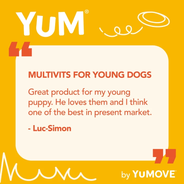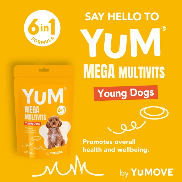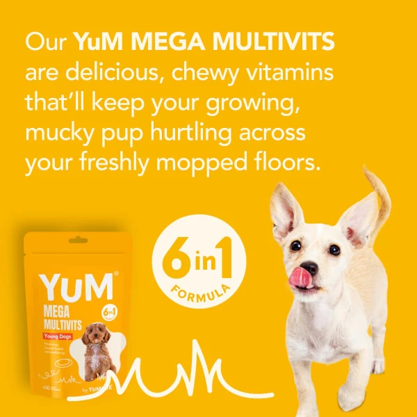 This 6-in-1 multivitamin provides your growing pup with chewy goodness for everyday wellness. YuM MultiVits 6 in 1 for Young Dogs, previously YuCARE MultiVits for Young Dogs, directly targets specific areas of the body with a powerful blend of natural ingredients – these include Omega-3 fatty acids, Vitamins C & E, B Vitamins, Zinc, and MOS and FOS prebiotics.