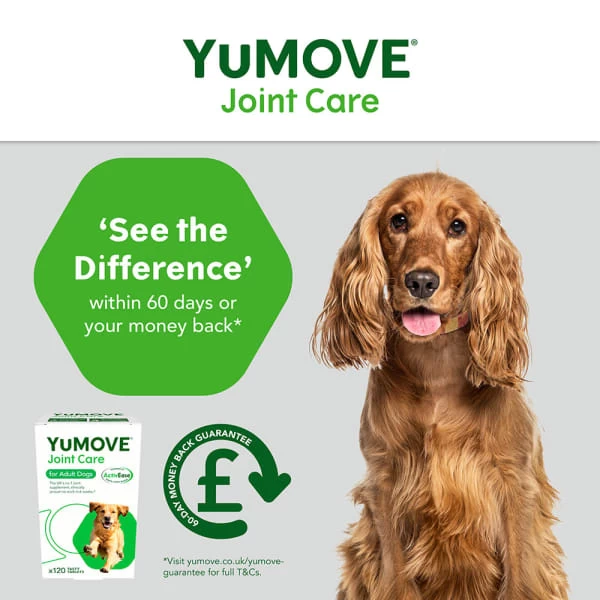 YuMOVE Adult is a clinically proven, triple-action joint supplement for dogs that aids stiff joints, helps mobility and supports joint structure. Recommended for dogs that are beginning to show joint stiffness. YuMOVE is formulated with ActivEase® Green Lipped Mussel containing 4x more active Omega 3 than standard competitor versions. It is an easy to give, tasty tablet that you feed daily. YuMOVE is the UK’s #1 veterinary joint supplement brand* helping over 1 million pets globally. Clinically proven to work in 6 weeks**.
